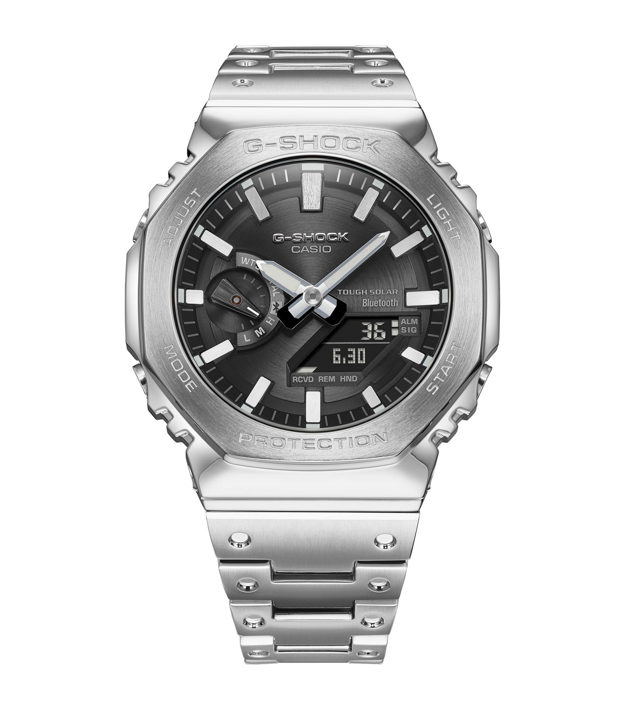 Edle Vollmetallkonstruktion: Das Gehäuse, die achteckige Lünette und das Armband – alles aus hochwertigem Edelstahl – sorgen für ein schlankes, minimalistisches Design und schützen das empfindliche Modul zuverlässig vor Stößen.